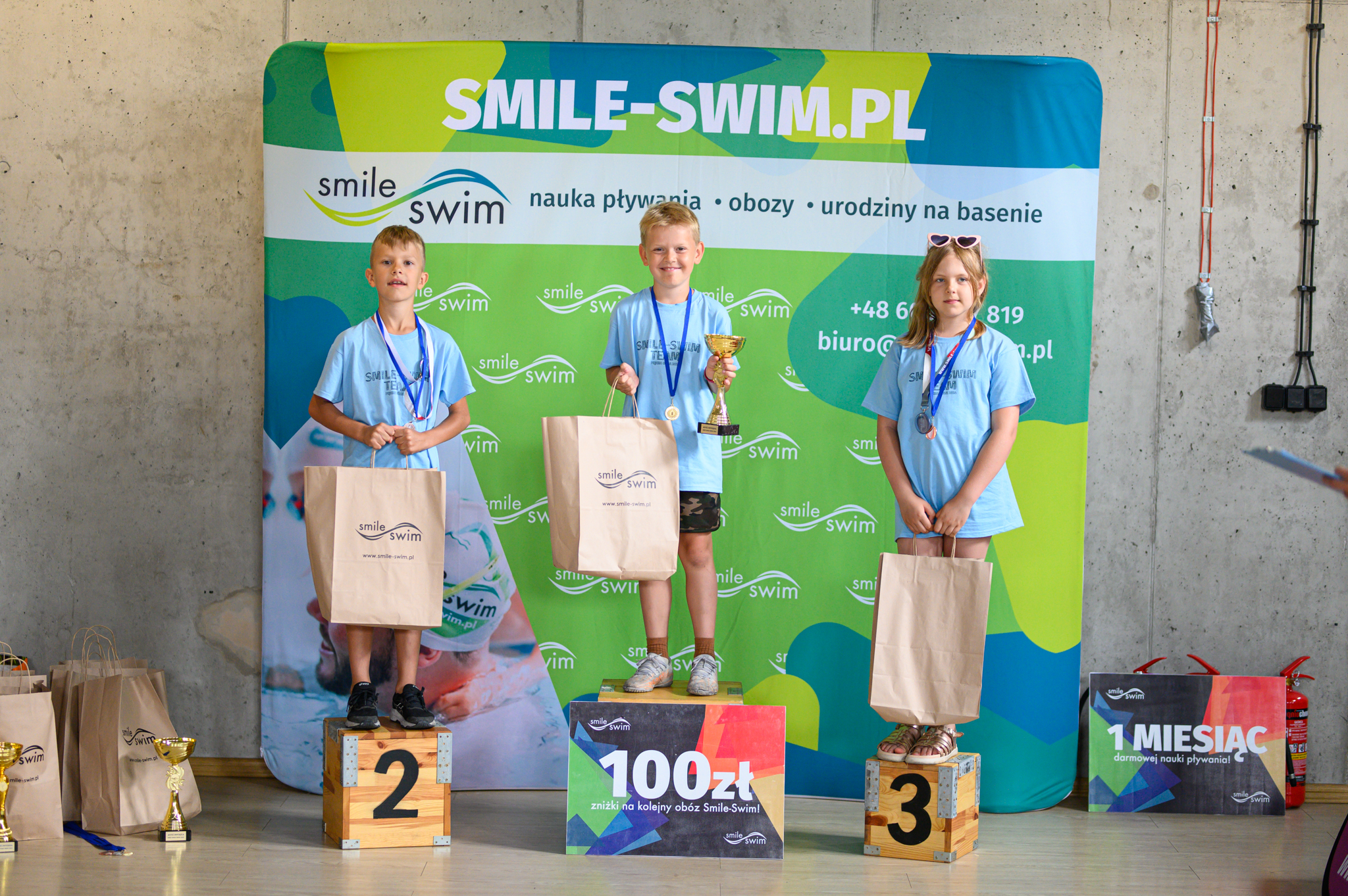 Rano nastąpiło wielkie podsumowanie obozu. Każdy obozowicz dostał pamiątkowy medal, dyplom z wierszykiem oraz koszulkę. Dodatkowo najlepsi zawodnicy z naszych smile-swimowych igrzysk zostali nagrodzeni w 3 kategoriach wiekowych. Do klubu weterana oraz rekruta dołączyły 4 nowe osoby! Gratulacje też dla superowego obozowicza, który zgarnął nową bluzę smile swim! <3 Później było też wspólne pamiątkowe zdjęcie na pomoście. Od 13:00 dzieci miały dłuższą budkę, aby mogły naładować telefony na podróż.