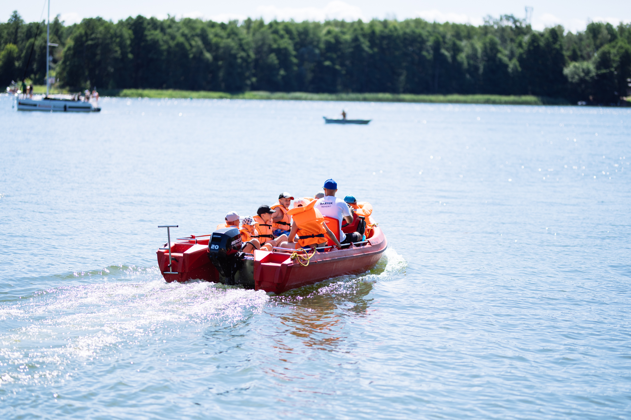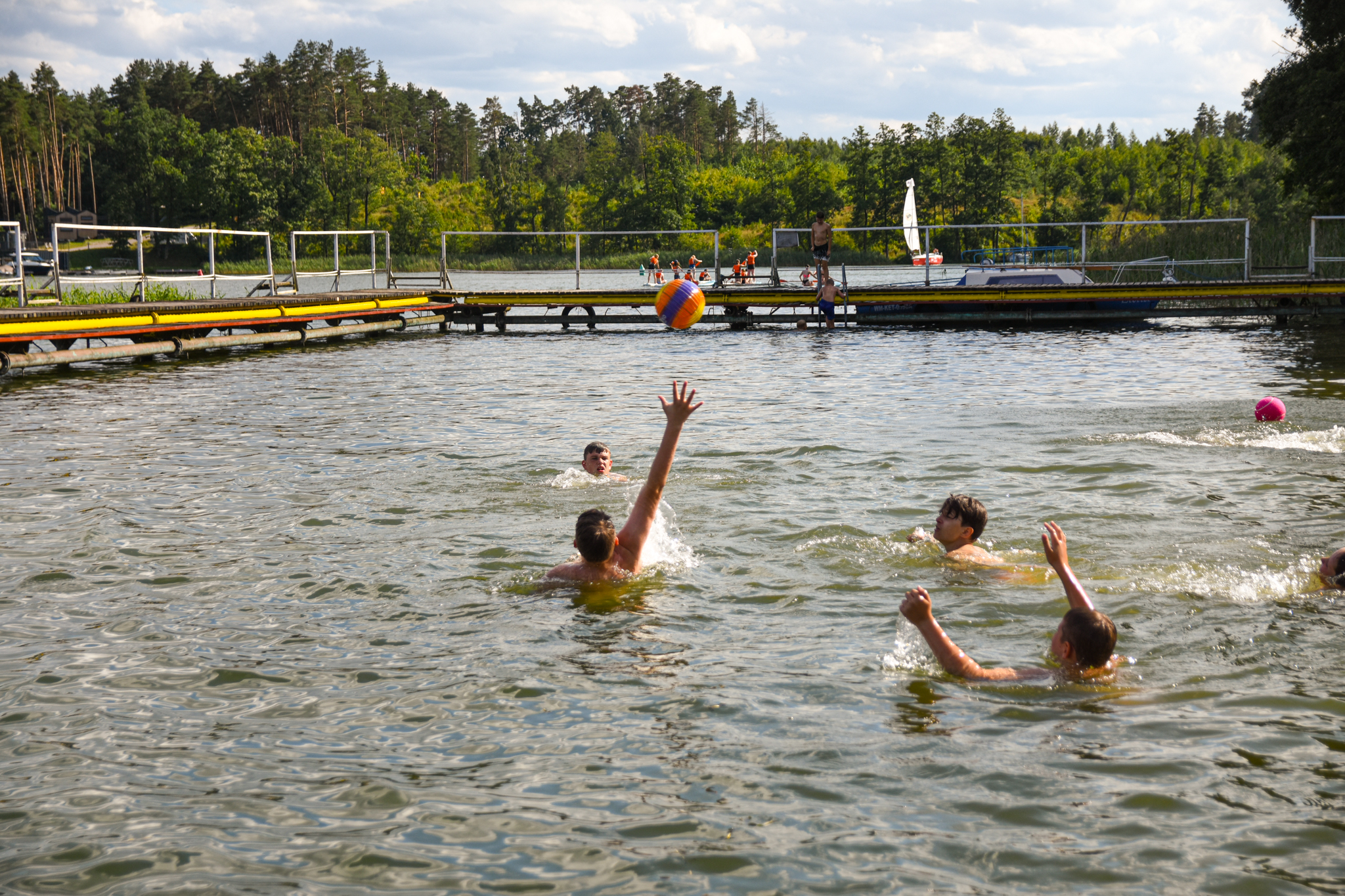 Rano grupy chillerowe zrobiły spacer na pobliską plażę, aby tam w spokoju pograć w różne gierki. W tym samym czasie grupa piłkarska oraz superowi wygrzewali się na piasku i zaliczali nasze atrakcje wodne (ślizgawka/motorówka ratownicza/giga trampolina/supy). Grupa wodna rozegrała nad jeziorkiem turniej baloniady, a później grała w naszą nową autorską ciuciubabkę – był szał! :) Grupa artystyczna rano robiła drewniane łódki, które później wodowała na jeziorze.
