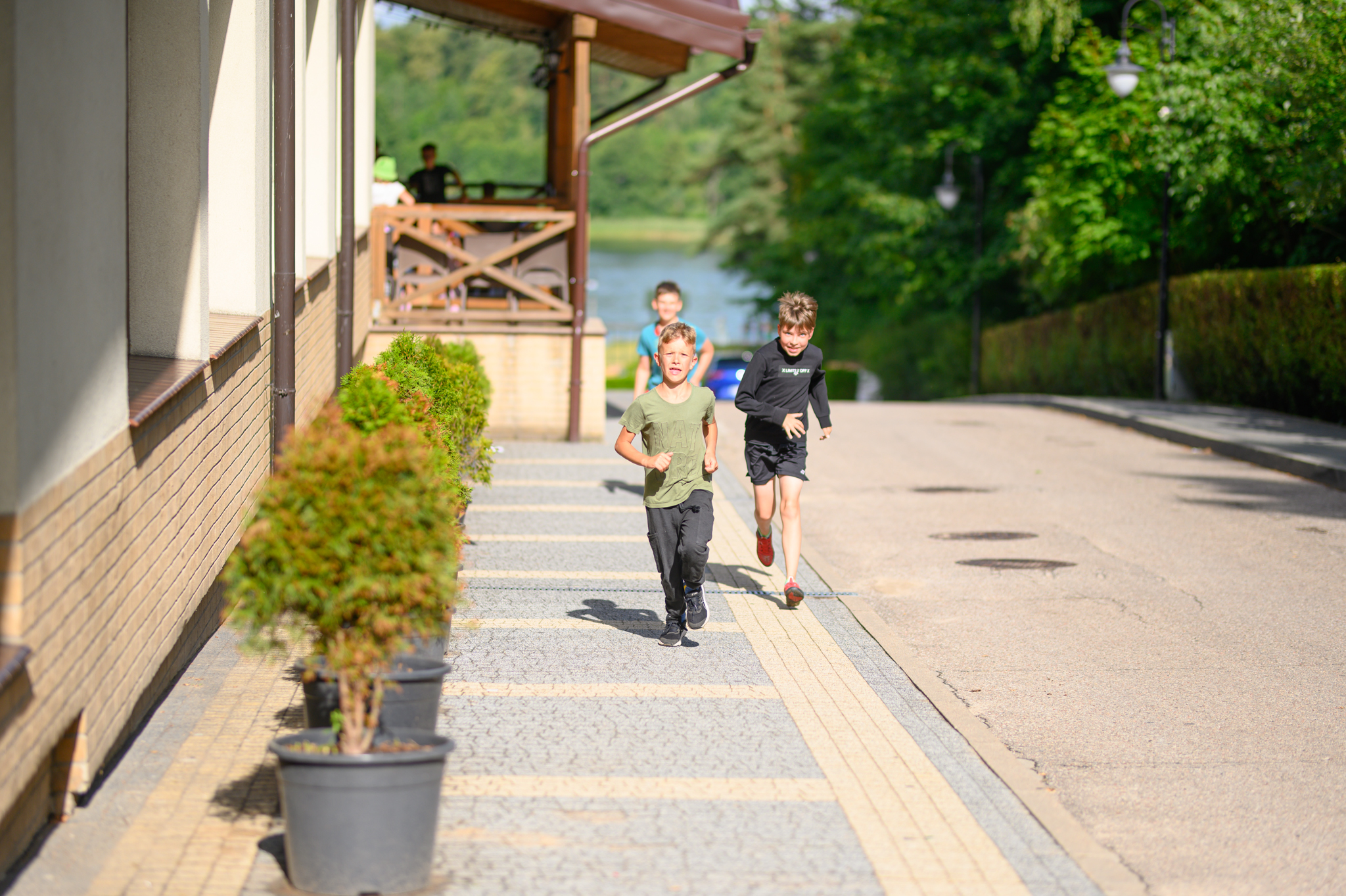 Po obiedzie było już bardziej aktywnie. Przestało padać i pokazało się słoneczko. Cały obóz grał w jedną wielką grę terenową. Dzieci podzielone były na 10 drużyn i biegały po całym ośrodku szukając kadry, która przygotowała 10 różnych stacji. Drużyna, która najszybciej odnalazła wszystkie stacje i wykonała zadania zdobyła słodkie nagrody!