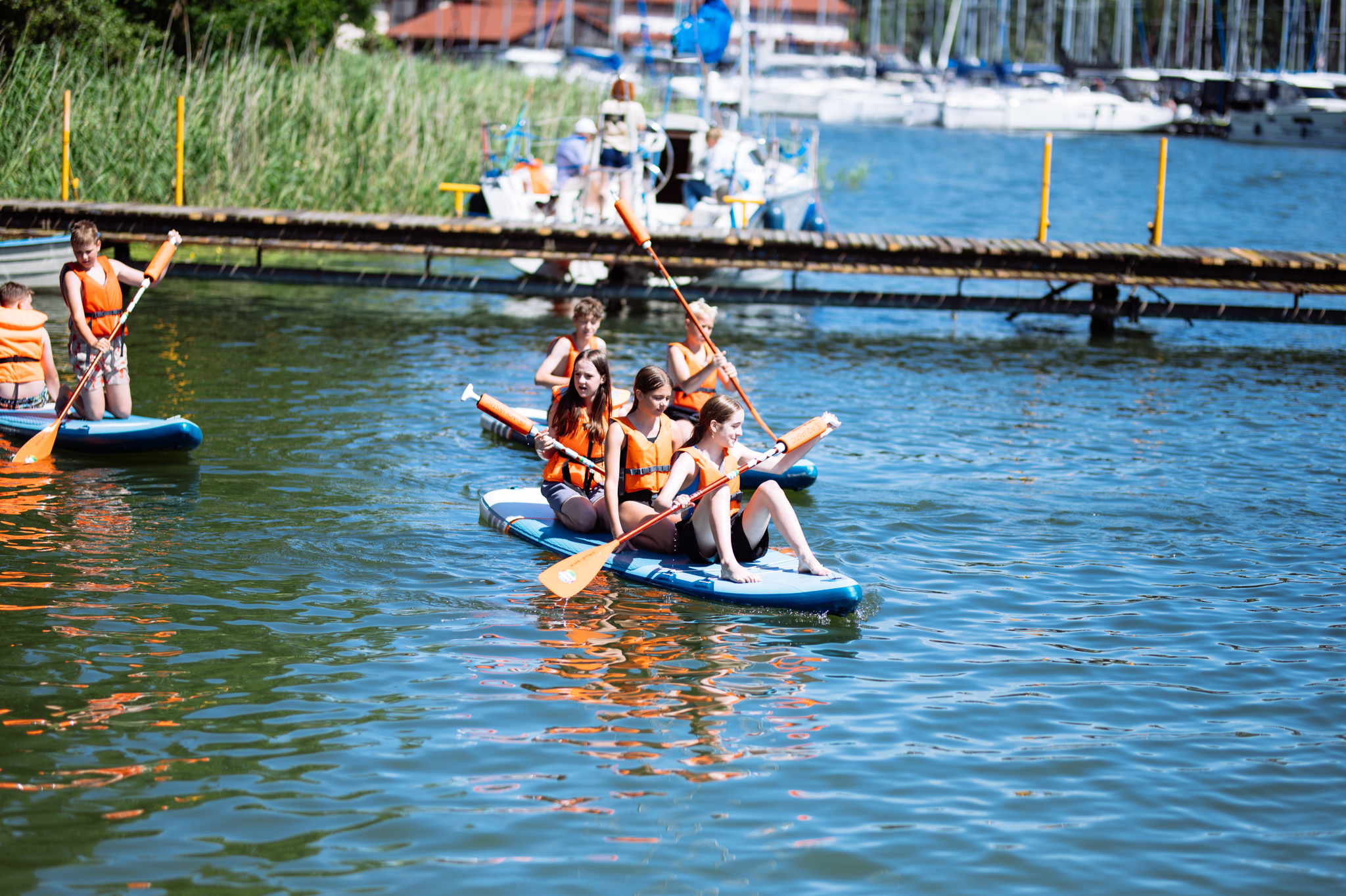 Po śniadaniu grupy superowe i chillout grali w lesie w grę terenową FLAGI. W tym samym czasie survival robił rekonesans lasu i budował bazę. Artyści poranek spędzili na rysowaniu w plenerze, a następnie był czas na badmintona i szybkie przywitanie z jeziorem. :) Piłkarze jak to oni – grali non stop! Najpierw na piasku, potem na trawie, a finalnie w wodzie. ;) Wodniaki rano pływały na SUPach i grali w siatkówkę plażową.