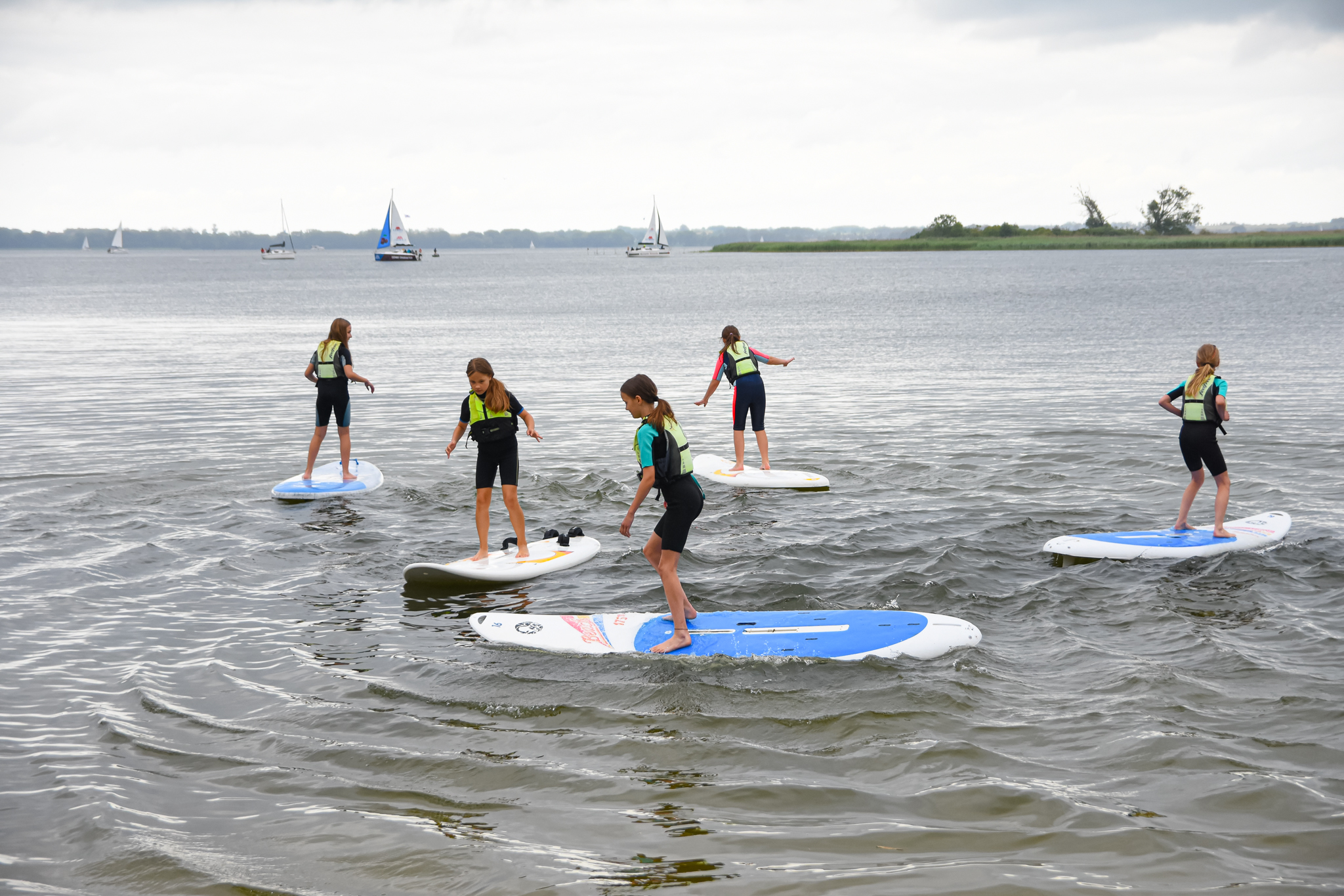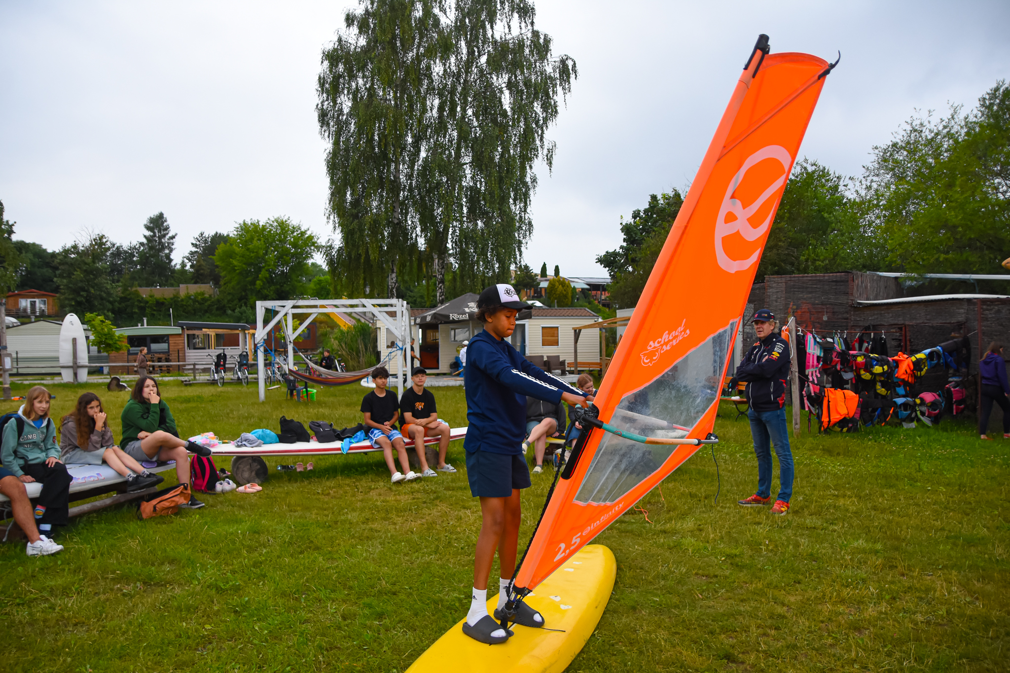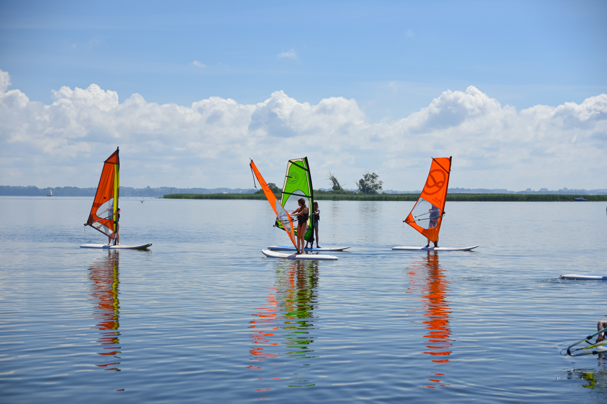 Po południu już połowa obozowiczów nie mogła wytrzymać, tak że wyszliśmy na plażę. :) Tam nawet przelotny deszczyk nie zniechęcił ich do kąpieli czy SUP- ów. ;) To prawdziwi fanatycy sportów wodnych! Ci, którzy stwierdzili, że poczekają na lepszą pogodę, mogli pograć w zbijaka czy badmintona. Grupa Wind-owa po południu rozpoczęła szkolenie. Początkujący mieli oswojenie z deskami w wodzie, a grupa zaawansowana przypomniała sobie podstawy z deską i żaglem na lądzie oraz manewry techniczne „na sucho”.
