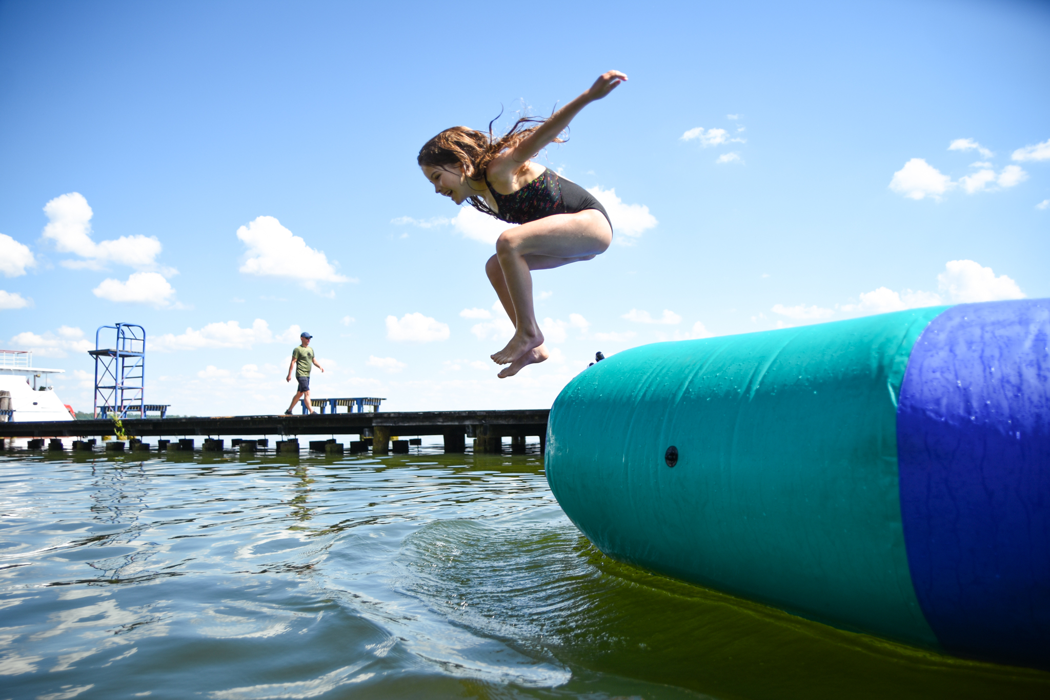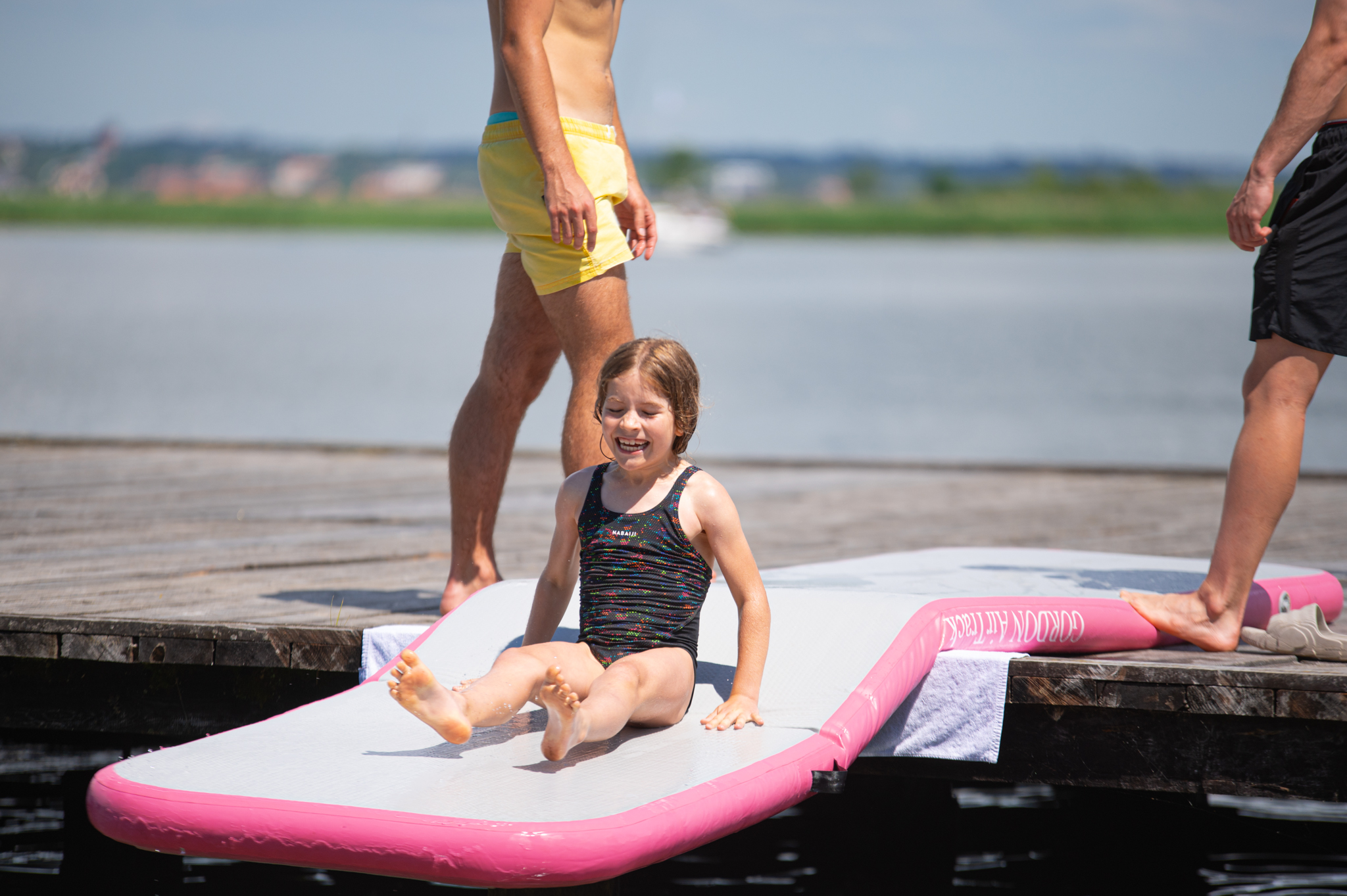 Po śniadaniu całą ekipą ruszyliśmy nad jezioro. Czekała tu na nas nowa smile-swimowa atrakacja – GIGA TRAMPOLINA WODNA! Oprócz skoków do wody klasyczny plażing smażing i wyprawa SUP-owa dla chętnych. :)